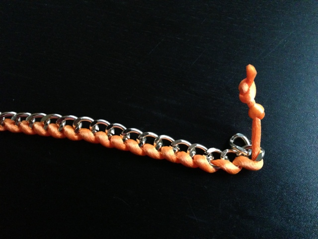 Hacemos dos cadenas con cordón de color, las unimos con la cadenita de strass con otro cordon más fino.